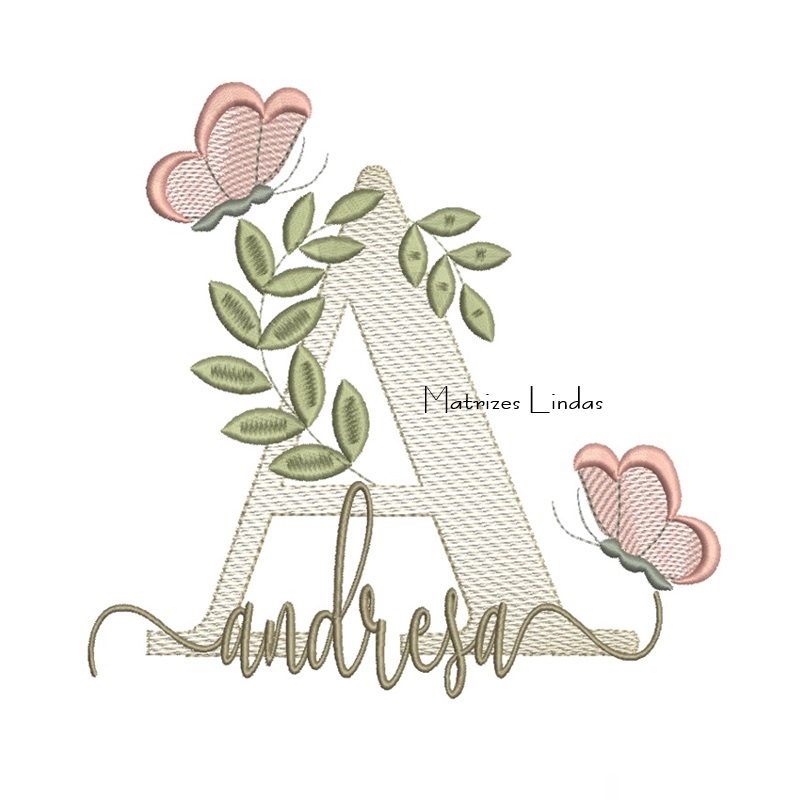 Matriz de Bordado Nome Andresa folhas e Borboletas