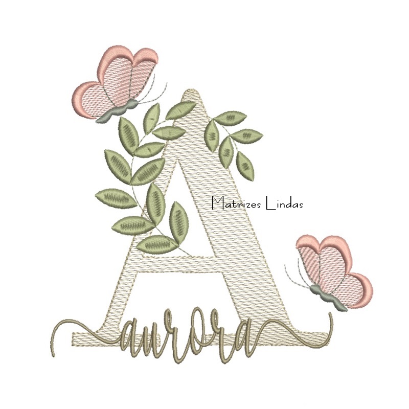 Matriz de Bordado Nome Aurora folhas e Borboletas
