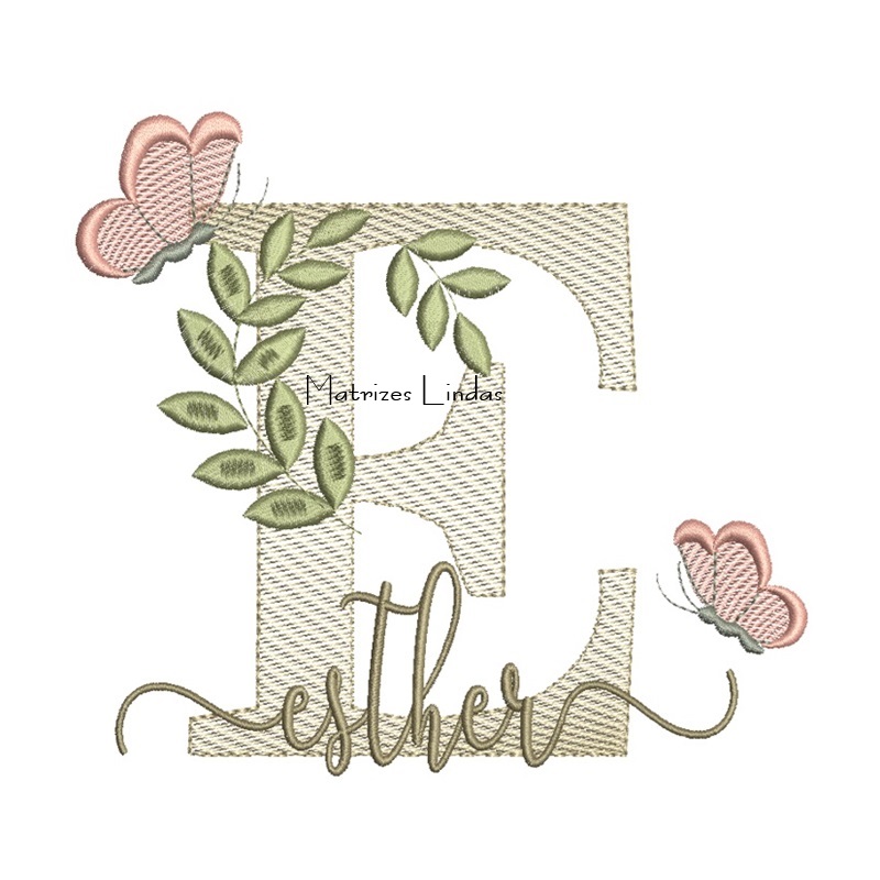 Matriz de Bordado Nome Esther folhas e Borboletas