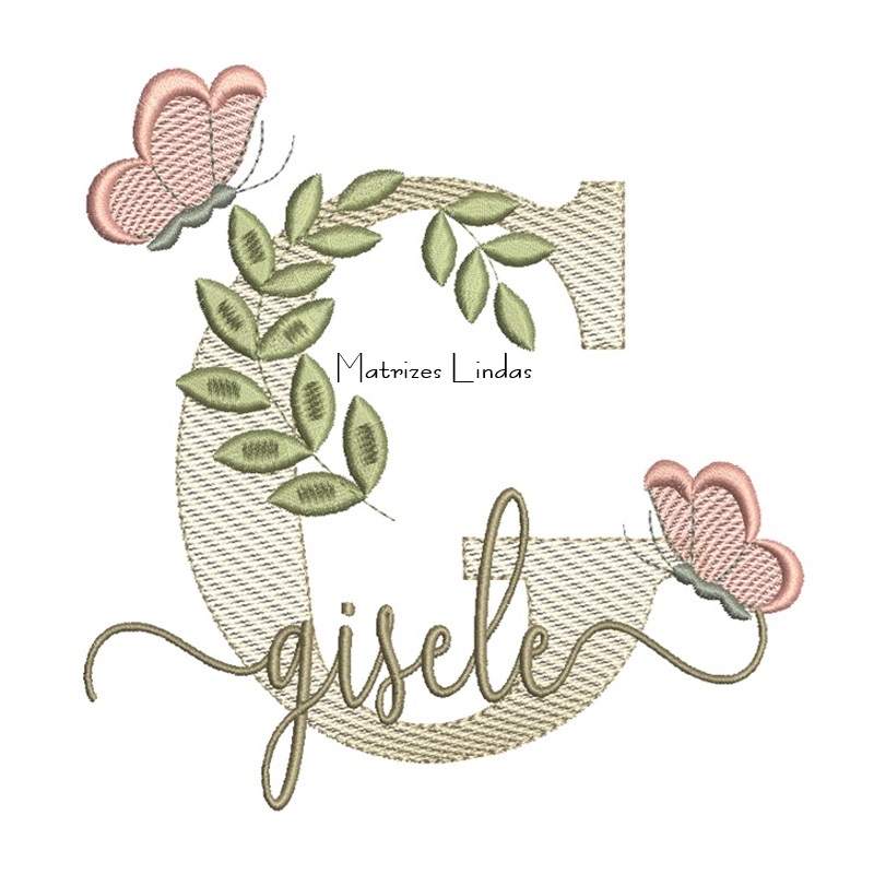 Matriz de Bordado Nome Gisele folhas e Borboletas