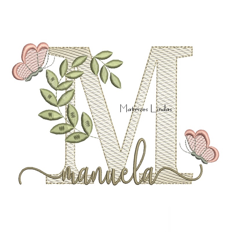 Matriz de Bordado Nome Manuela folhas e Borboletas