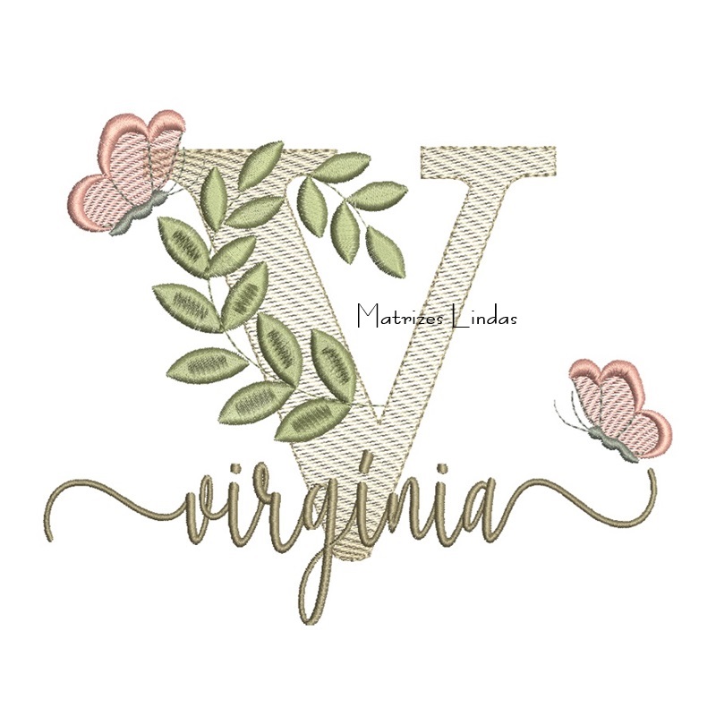 Matriz de Bordado Nome Virgínia Folhas e Borboletas